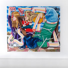 In his second solo exhibition at Galerie Droste, entitled DAY OFF IDEAS, Ezer focuses on large-scale group scenes showing the protagonists engaged in leisure activities. The artist describes them as micro-communities organized around their activities. In their actions, the movements coalesce or dissolve into each other as if into a fabric, reinforcing with their dancing gestures, the particular composition of which they have become a part. Their actions are banal everyday occurrences that, like painting, provide space for contemplation and inner attention. The title of the exhibition refers in the course of this, to the emerging tension between forged plans and their actual implementation, as well as further to the often associated illusion of attaining personal freedom and prudence. The title tries to describe the state in which we should feel good, but the gravity of this fact makes it impossible from the outset to live the perfect and unclouded moment.